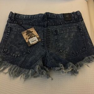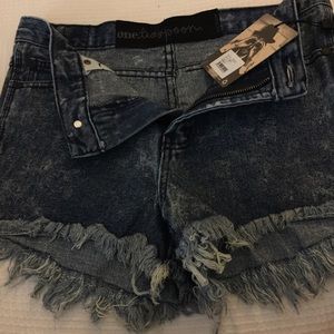 A high, denim cutoff hemline flaunts legs from hip to heel on One Teaspoon's distressed shorts.