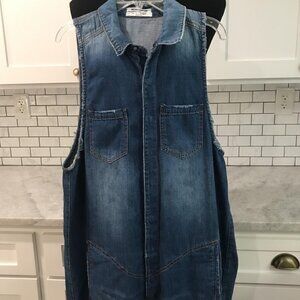 Item: Sleeveless denim jumpsuit/boiler suit overalls with snap-front placket