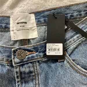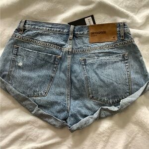 Trendy distressed jean shorts. Classic blue denim. Perfect for casual wear.