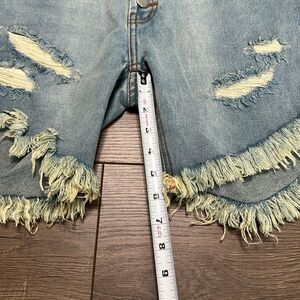 One Teaspoon Frankies Long Length Button Fly Fringe Blue Jean Shorts Size 25. Excellent condition! 99% cotton/1% polyester. Fits like a slouchy boyfriend. Cut away side seams designed to show outer thigh. See pictures for measurements