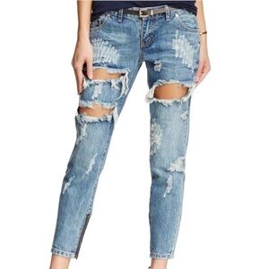 Meet your new favorite distressed skinny jean! Heavy distressing on both legs, a low waist, and ankle zips complete these perfectly disheveled jeans.