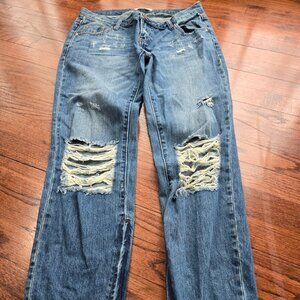 One Teaspoon Freebirds jeans. These are in a medium blue distressed wash with zippers at the ankles. They are a size 30 and measure as follows: waist-33 inches, hips-38 inches, rise-7.5 inches, and inseam-26 inches.