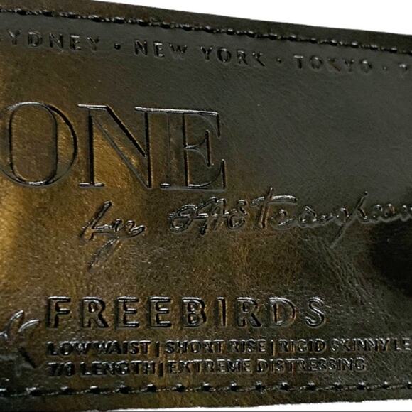 One Teaspoon Freebirds Extreme Distressed Low Rise Jeans. Features classic destroyed rigid denim with extreme distressing, vintage inspired look, zipper ankles, low waist, slim leg. 100% cotton. Great preowned condition, no notable flaws.