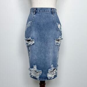 Size 25 One Teaspoon Freelove denim skirt. Distressed medium wash denim fabric. 100% cotton. Back zipper and slit. Intentional holes and distressing. Great condition!