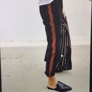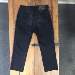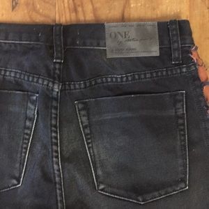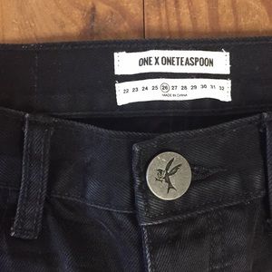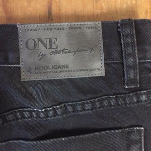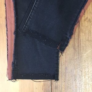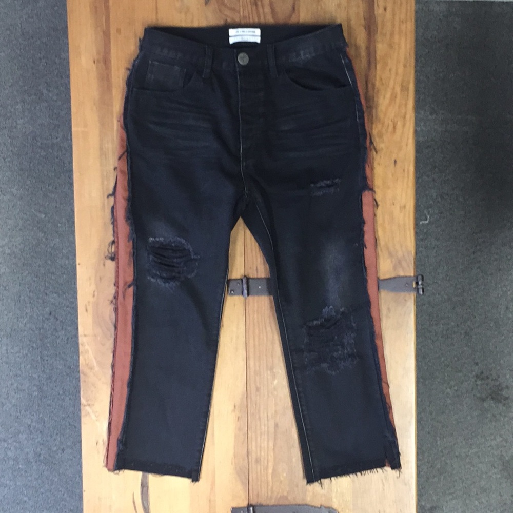 Like New. Never Worn. One Teaspoon Hooligans. Distressed Denim, Rigid, Cropped Flare, High Low Raw Hem, Low Waist, Relaxed Fit, Button Fly, Five Pockets, Jeans are two tones of Black and a Rust. MK167