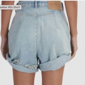 Brand new One Teaspoon Streetwalker Shorts in Kansas. A vintage inspired denim high waist shorts with 80s tailored details. Boasting an inverted front yoke seam and pleats to add shape to the hips. Relaxed through the thigh and tapers in to the hem which has been rolled enough to give it some weight. Fabric: Heavyweight, non-stretch denim. Darts and pleating at seamed yoke. Acid-wash finish with dirtied fading. Frayed, fixed cuffs. Button closure and zip fly. Slant hip pockets.