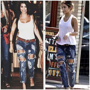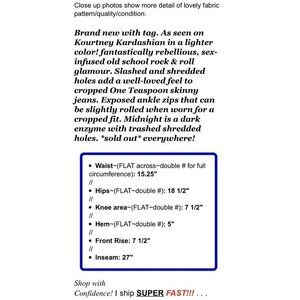 Brand new with tag. As seen on Kourtney Kardashian! fantastically rebellious, sex-infused old school rock & roll glamour. Slashed and shredded holes add a well-loved feel to cropped One Teaspoon skinny jeans. Exposed ankle zips that can be slightly rolled when worn for an even more cropped fit. Midnight is a dark enzyme with trashed shredded holes. *sold out* everywhere!