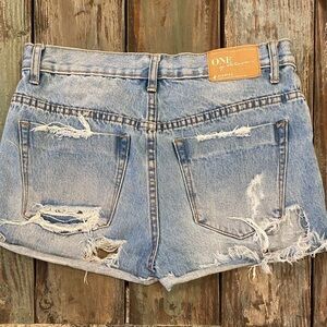 ONE By One Teaspoon Size 5 (27) Denim Shorts, Hawks, High Rise, Button Fly, Destroyed, Ripped Butt, Relaxed Fit, Twisted Cuff Hem. Preowned. These shorts are VERY distressed. Waist measures approx 29”. Rise measures approx 10.25”. There are rips in the butt - the perfect shorts for the girl with lots of self-confidence!