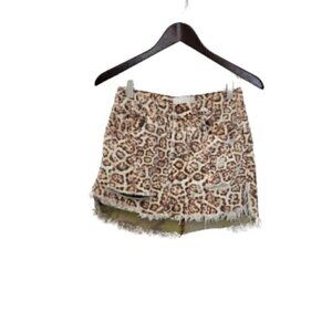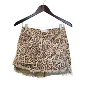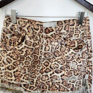 Leopard printed denim mini skirt. Button fly front closure. Mid-rise. Distressed detail throughout. Frayed raw hem. Five pockets.
