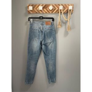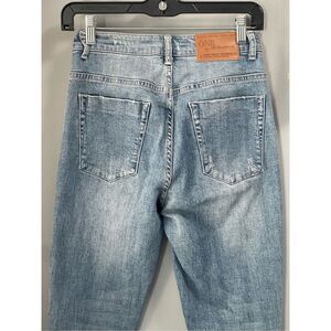 No damage, factory distressing. High waisted w stretch. Back leather tag has style/fit info