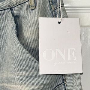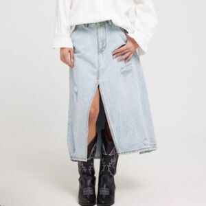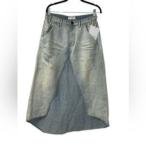 One Teaspoon Distressed Blue Denim Skirt,Zipper/button closure,High split hem.Approx measurement Waist 29”,Length Short-longer length 10” 29”.NWT