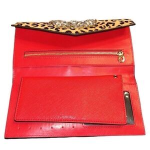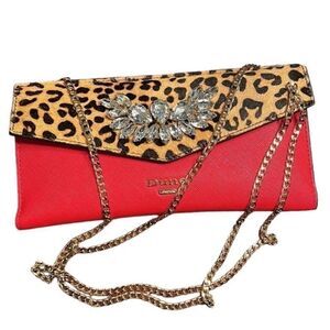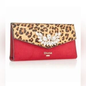 Dune Leopard Print/Red Wallet on Chain Bag. Credit Card Holder. Has a minor indentation from chain,Minor interior cracking,Please review photos.Removable chain.NWOT