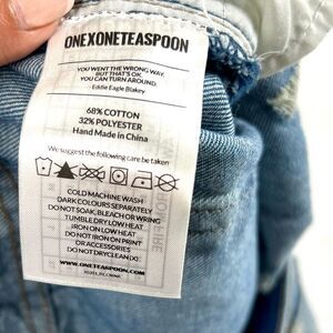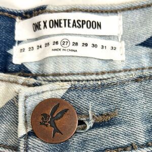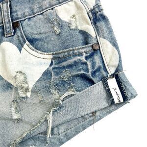 Gently worn One Teaspoon Bandits heat shorts. Stylish denim shorts featuring a playful heart print. Perfect for casual outings. Button fly and distressing throughout.