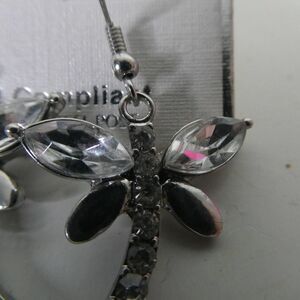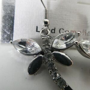 New on card dangly dragonfly earrings. Features silver tone metal, surgical steel lead compliant fishhooks and clear rhinestones.