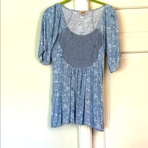 One World Babydoll Top Blue Patterned Appliqués Scoop Top Small Like New