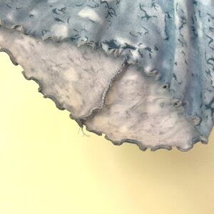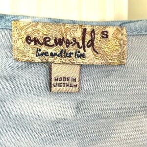 One World Babydoll Top Blue Patterned Appliqué Scoop Top Small Ruffle Hems NWOT