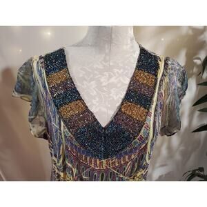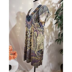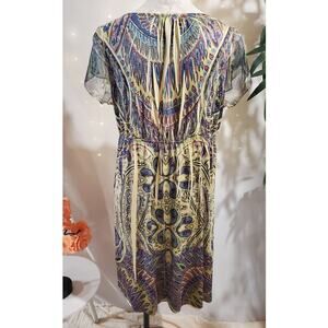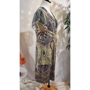 One World Beaded V-Neck Paisley Dress Size XL Boho Hippie Short Sleeve Stretch