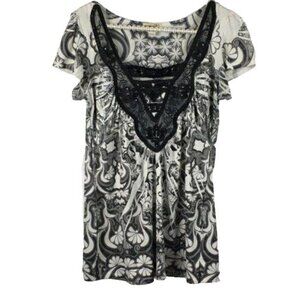 This ONE WORLD Black & White Paisley Lace V-Neck Top S is a chic and versatile addition to any wardrobe. The paisley lace design in black and white adds a touch of sophistication.