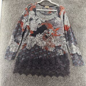 One World Boho Large long sleeve multicolor bottom lace accent blouse