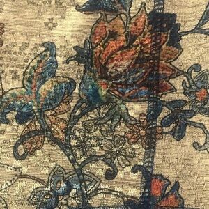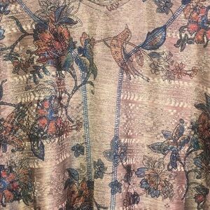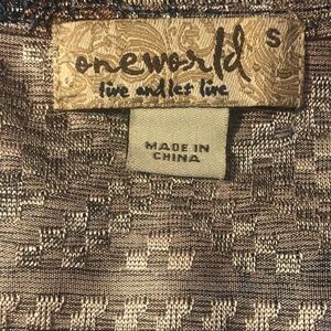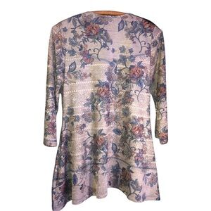 One World 3/4 length sleeve top made from colorful metallic fabric with floral print. This shirt is in excellent condition with no defects or stains noted. Polyester and spandex.
