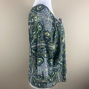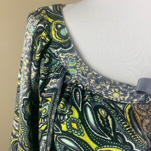 One World Elbow Sleeve Blouse Size M Black Gray Yellow, Paisley Boho Print