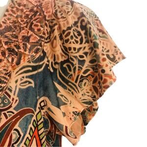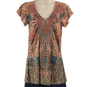 One World Beautiful Coral Orange Turquoise Paisley Bling V Neckline Popover Top