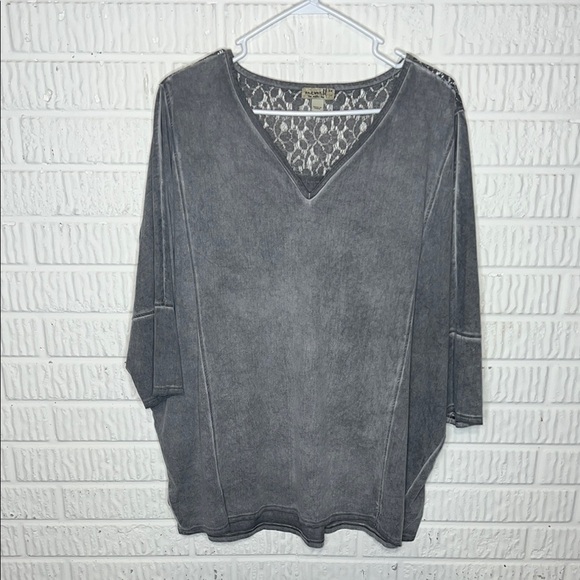 Stylish gray V-neck top with lace detailing. Perfect for casual outings.