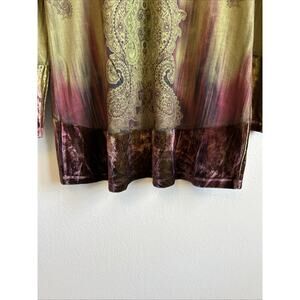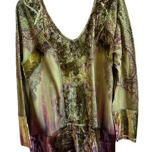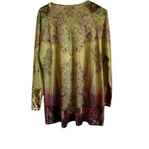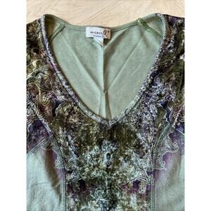 One World Green Multi Velvet Top Med-L Embroidered Flare Sleeve Whimsigoth Boho