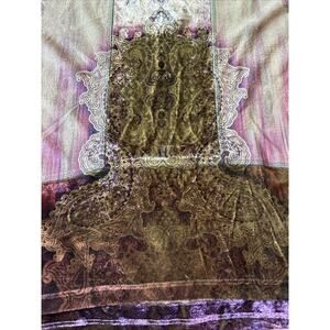 The One World Green Multi Velvet Top is a whimsical and boho-inspired blouse designed for women in size large. This top features a beautiful embroidered design on a green and purple velvet fabric, with flared sleeves that add a touch of flair to the overall look. Perfect for those who embrace the unique and creative, this top is a statement piece that can be styled in various ways to suit different outfits and occasions. Ideal for those who appreciate a blend of elegance and bohemian style in their wardrobe.