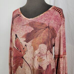Item: One World Leaf Print Dress Red M Medium Women's NEW long sleeve embroidered accents / decor at shoulders and on sleeves
