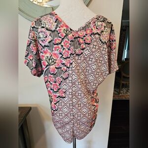 One World Live And Let Live Size Medium V-neck Mixed Media T-Shirt Floral Tiles. Please see the measurements in photos provided. In excellent Pre-owned condition. Cross posted. I ship out same or next day. Thanks for looking!