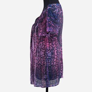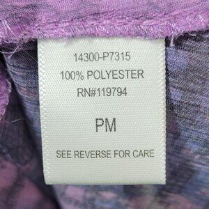 Colorful purple and pink One World "Live & Let Live" blouse in a flattering petite medium fit. Features a lightweight, flowy design perfect for a vibrant and bohemian look.