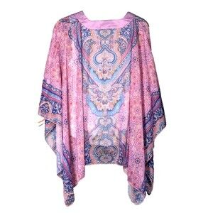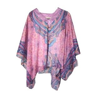 The item pictured is a One World Live & Let Live brand poncho-style top, likely featuring a chiffon overlay with a colorful, intricate pattern.