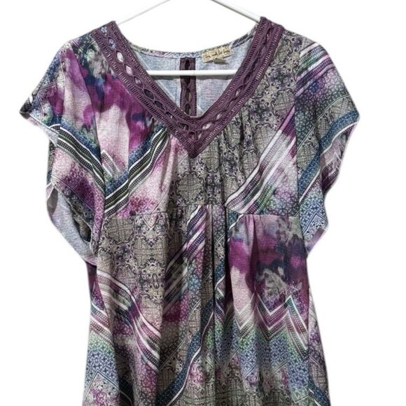One World Live and Let Live Women Size Large Flutter Sleeve Blouse Stretch City