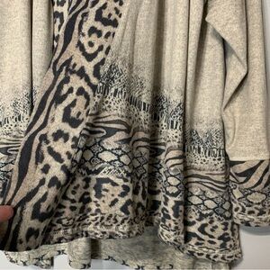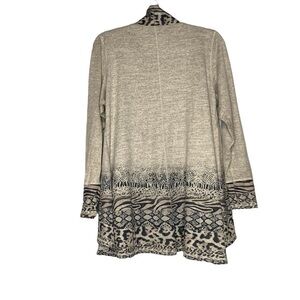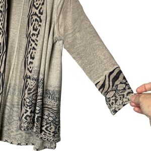 One World Live and Let Live heathered grey tan oatmeal multi animal print draped long sleeve longline cardigan sweater. This cardigan was produced using a special printing process that makes each piece unique. Color shading and fabric imperfections are inherent to the process and add to the singular beauty of each item. Climb into this cozy, soft, comfortable cardi! There is a small pull on the interior sweater, but is not visible on the exterior (note in both photos). Size XL