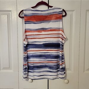 One World Live and Let Live sleeveless red, white, blue striped tee, size XL, 95% polyester 5% spandex, v-neck, 3 faux buttons down front, rhinestones at bottom of neckline, extremely soft stretch material, excellent condition.