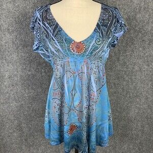 One World Paisley Top Women M Thin Jersey Ruffle Cap Sleeve Peplum