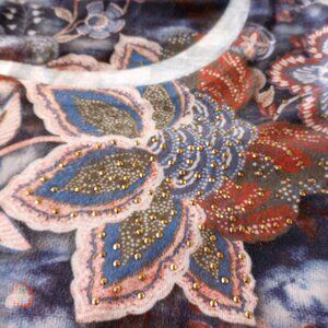One World live and let live, Pull over blouse size XL, Scoop neckline, on left side gold barbs, measurements pit to pit 21", shoulder to hem in front high 26", shoulder to hem in back low 28", no rips tears stains