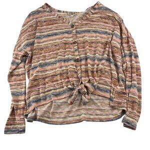 One World Striped Button-Front Top L Polyester/Spandex Blend