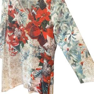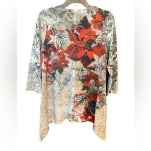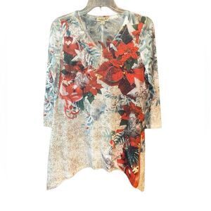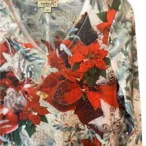 One World Sz M Christmas Holiday Red Poinsettias Rhinestones V-Neck Top