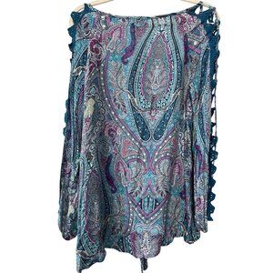 This vibrant boho tunic by One World features a teal and purple paisley pattern accented with intricate lace trim. Lightweight fabric ensures comfort and effortless style.