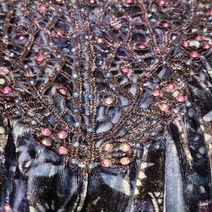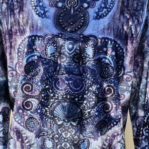 97% Polyester 3% Spandex half sleeve Scoop neck, pull on, velvet, velour, top in beautiful blue, purple, green floral, mandala style print with crochet and colored rhinestones around neck and front.