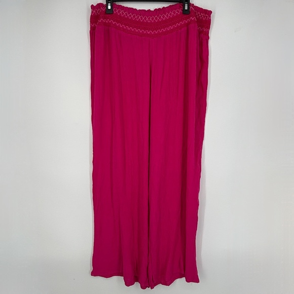 One World Womens 1X Pull-On Wide Leg Pants Bright Pink Crinkle Gauze Embroidered