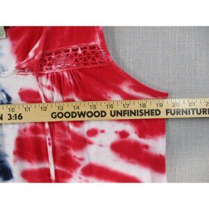 This sleeveless top combines vibrant red and navy tie-dye patterns with a comfortable fit. Its rayon-spandex blend offers a soft and stretchy feel.