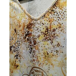 One World Women's Size Large Abstract Gold Yellow V-Neck Asymmetric Hem Top Embellished 3/4 Sleeves
