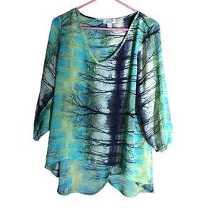 One World size Large split back top blouse green tree print sequins semi sheer