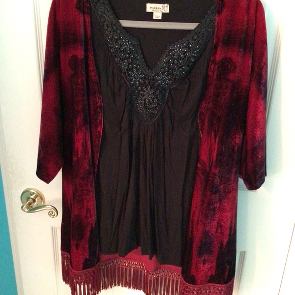 @lucylui108 the jacket is 30 inches long from shoulder to fringe. It is brand new with tags, never worn. Tank is 96% rayon 4%spandex. The vest is 97 % poly 3%spandex