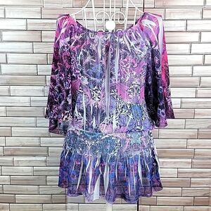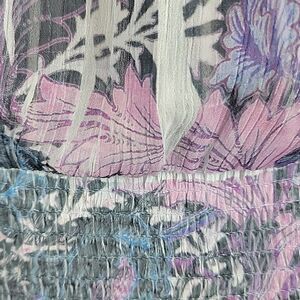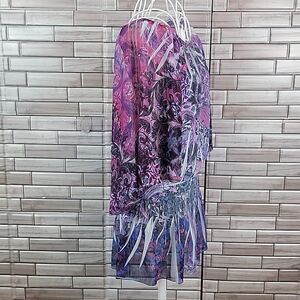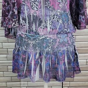 100% polyester floral art print blouse in hues of pinks and purples. Flowy butterfly sleeves with a round gathered neckline to a drop down elastic waist creating a ruffled hemline. Great pre-owned condition