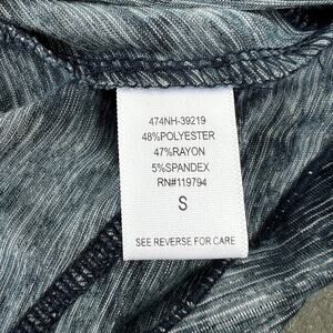 ONE WORLD women’s S handkerchief hem top. Heathered Blue with silver shimmer. Scoop neckline with metal beading adoring neckline. Cap sleeves.