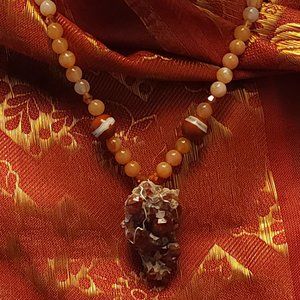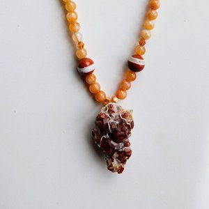 Offering this one of a kind necklace centered with a natural mineral specimen of spessartine garnet crystals on smokey quartz. The rest of the beads include vintage-made carnelian, 2 banded evil eye beads of jasper glass and tiny crystal bicones. It's adjustible in length from 17 to 20 inches; the garnet specimen drops 1 3/4 inches, wired in sterling silver.